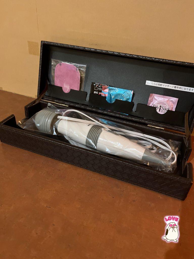 しばらく堪能してもらった後、すでに袋から出し専用のゴムをつけた電マを手に取ります。
